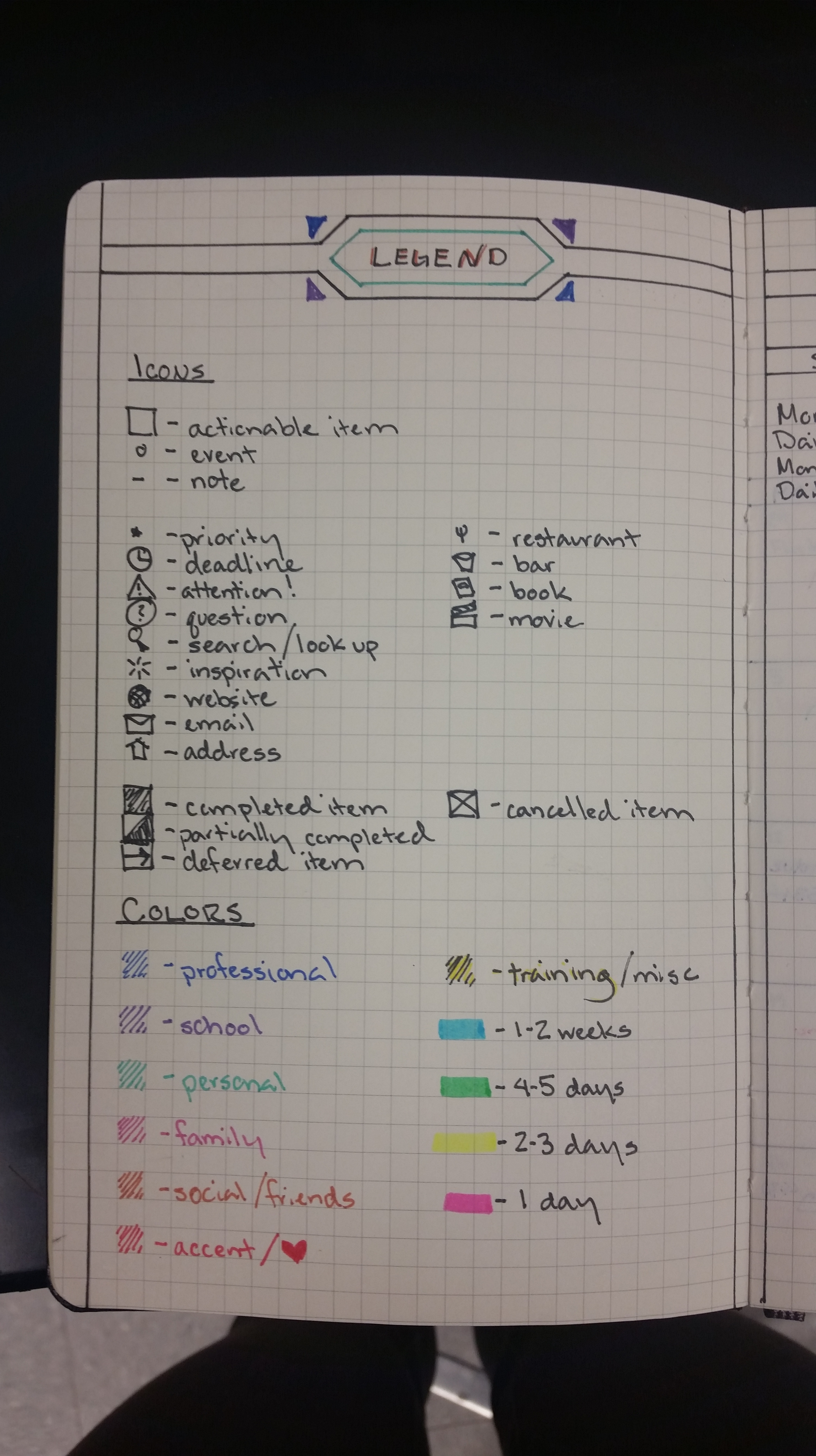 OK! In my attempt to be creative, I color coded my entries by area of life that entry pertains to….sounds confusing but here’s a picture!