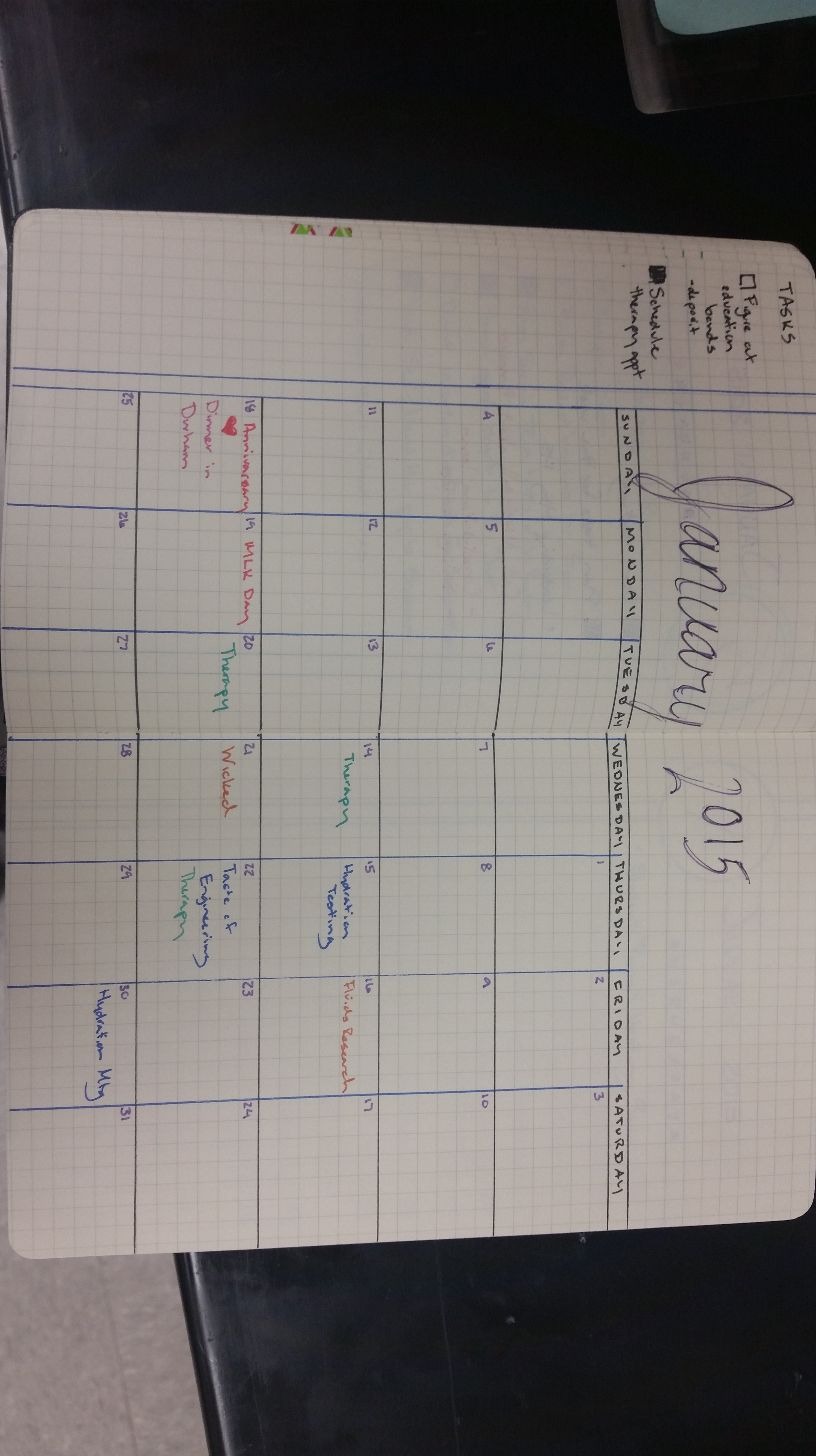 After the index/definitions are set up, you can start writing your shit down! I’ve found that having both a monthly and daily section works best. I need to plan some things pretty far out in advance (academic conferences, races, and the like) so I put those things in the monthly calendar.